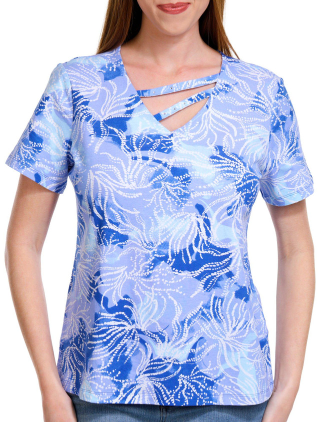 The Petite Print Crisscross Short Sleeve Top offers a perfect blend of style and comfort. Crafted from a soft 95% cotton and 5% spandex fabric, it provides a breathable, stretchy fit. The crisscross neckline adds a trendy, flattering touch, while the print design brings a pop of personality. With a 24-inch length, this top is ideal for casual outings or everyday wear, combining ease and elegance effortlessly.