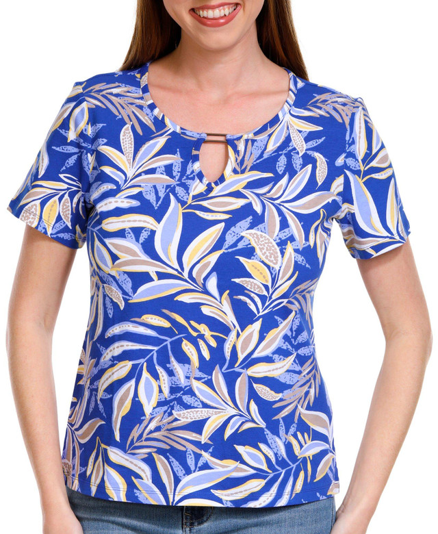 The Petite Print Keyhole Short Sleeve Top offers a perfect blend of style and comfort. Crafted from a soft 95% cotton and 5% spandex fabric, it provides a breathable, stretchy fit. The keyhole neckline adds a trendy, flattering touch, while the print design brings a pop of personality. With a 24-inch length, this top is ideal for casual outings or everyday wear, combining ease and elegance effortlessly.