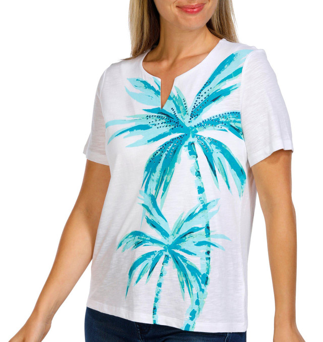 Add a touch of sparkle to your casual style with this Petite Split Neck Top. Featuring a heathered finish, side palm tree print, and rhinestone embellishments, its designed with a flattering split neckline and short sleeves for easy, breezy wear. Fabrication 100% cotton