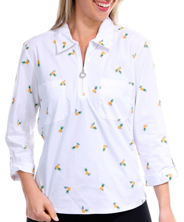 Add some flair to your wardrobe with this Petite Printed Zip Front 3/4 Sleeve Top! Featuring a chic 1/4 zip-up collared neckline, functional chest slip pockets, and a sleek printed design, it's perfect for both style and convenience. Made from 67% cotton, 29% polyester, and 4% spandex, it offers a comfortable, stretchy fit that's perfect for everyday wear.