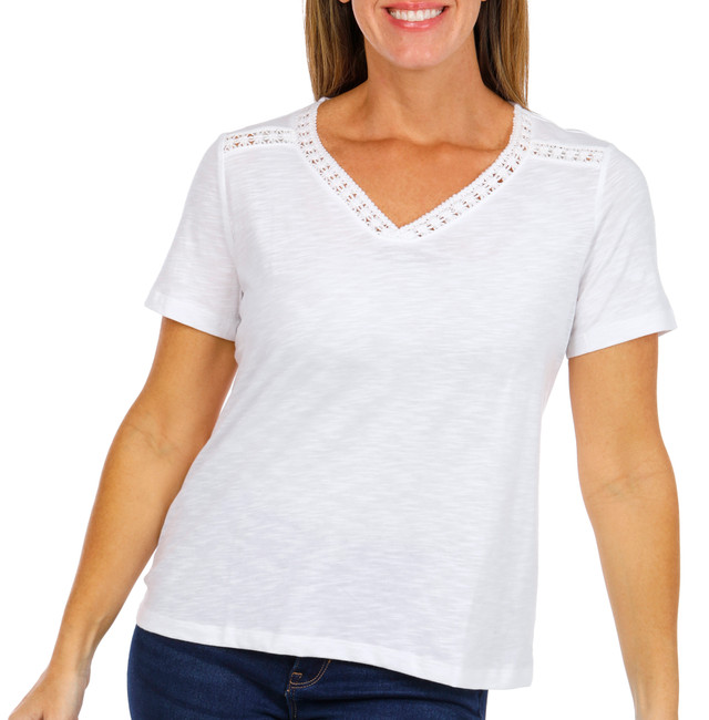 Coral Bay Petite Short Sleeve Crochet Trim V Neck Top