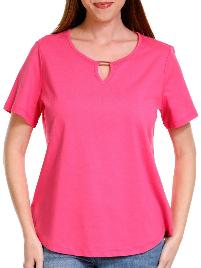 The Short Sleeve Everyday Tee is crafted from soft cotton, offering ultimate comfort for daily wear. Featuring a stylish keyhole neckline with a rectangle bar detail, this tee adds a subtle yet chic touch to your casual wardrobe. The breathable fabric ensures you stay cool and comfortable throughout the day. Top length measures approximately 24 in.