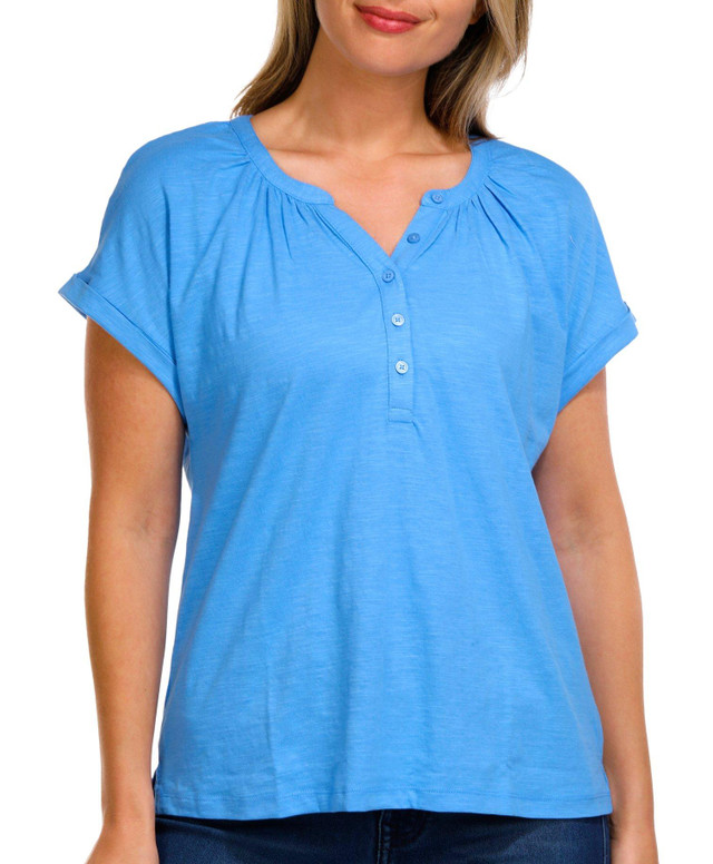 Elevate your everyday wardrobe with the Women's Solid Dolman Henley Short Sleeve Top, crafted from 100% cotton for ultimate comfort and breathability. This versatile top features a relaxed dolman sleeve design that effortlessly blends style and ease, making it perfect for casual outings or leisurely days. The classic Henley neckline adds a touch of timeless charm, while the soft, durable fabric ensures a flattering fit that feels as good as it looks.
