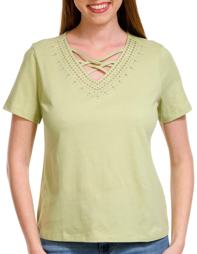 The Solid Lattice Keyhole Short Sleeve Top combines style and comfort effortlessly. Made from a soft 60% cotton and 40% polyester blend, it offers a breathable, lightweight fit. The lattice keyhole design adds a chic touch, while the embellishments provide a unique, fashionable detail. With a 24-inch length, this top is perfect for casual wear or dressing up for a more polished look.