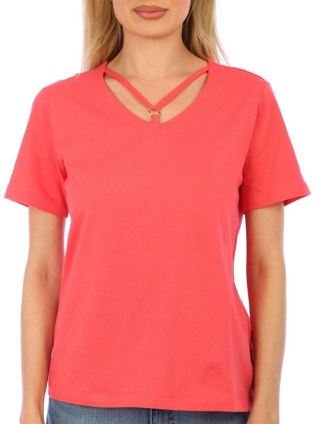Elevate your everyday style with our Short Sleeve Top. This chic piece features a solid color design, perfect for versatile pairing with your favorite bottoms. The standout neckline strap details with a metal o-ring add a touch of modern flair, making this top a unique addition to your wardrobe. Comfortable and stylish, it's ideal for both casual outings and dressier occasions. Top length measures approximately 22 in.