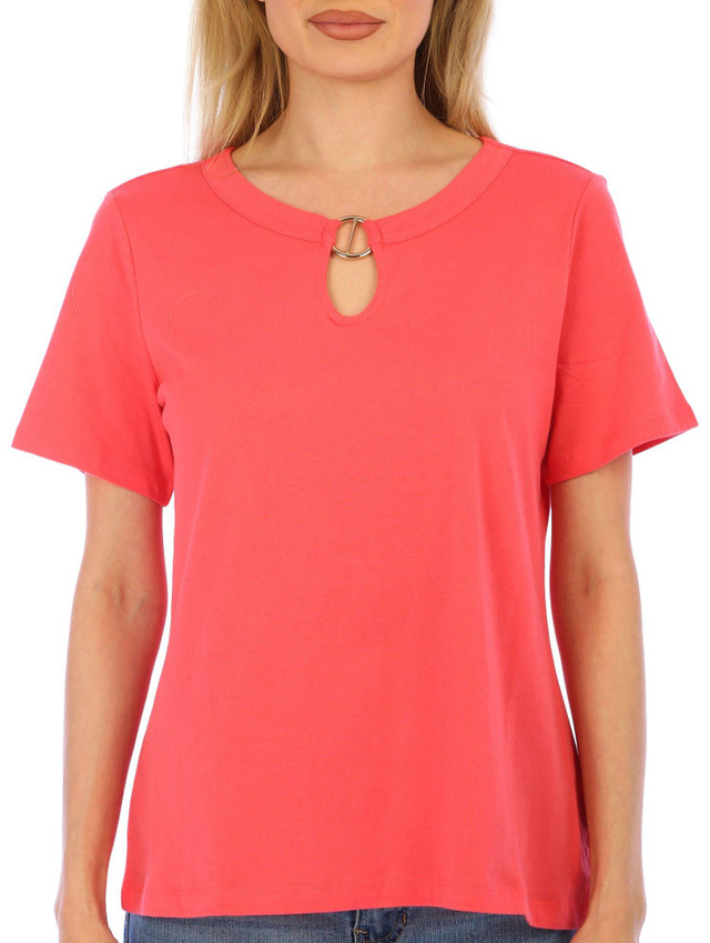 Elevate your everyday style with our Short Sleeve Top! This versatile piece features a solid color design, perfect for mixing and matching with your favorite wardrobe staples. Made from soft cotton, it offers a comfortable and breathable fit for all-day wear. The split neckline with metal ring detail adds a touch of modern flair, making this top a standout addition to your collection. Top length measures approximately 23 in.