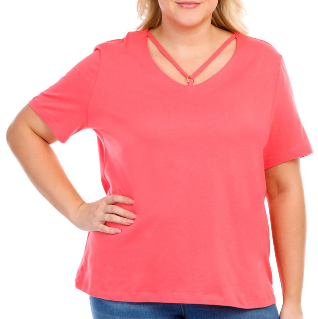 Introducing this short sleeve tee by Coral Bay, a stylish essential for your wardrobe. This solid color tee features a unique criss-cross O-ring neckline detail, adding a touch of flair to a classic design. Made with soft, breathable fabric, it ensures all-day comfort while keeping you effortlessly chic. The top length measures approximately 27 in. Fabrication 100% cotton.