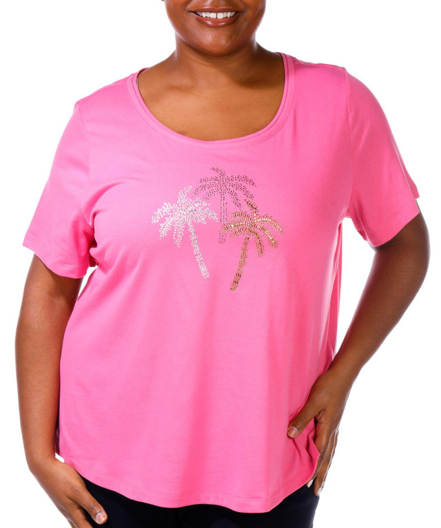 Bring the tropics to your closet with the Plus Embellished Palm Tree Trio Short Sleeve Top! Made from a soft 60% cotton, 40% polyester blend, its comfy, breezy, and full of island vibes. The trio of sparkling palm trees adds playful charm, and its 25 length makes styling a breeze.
