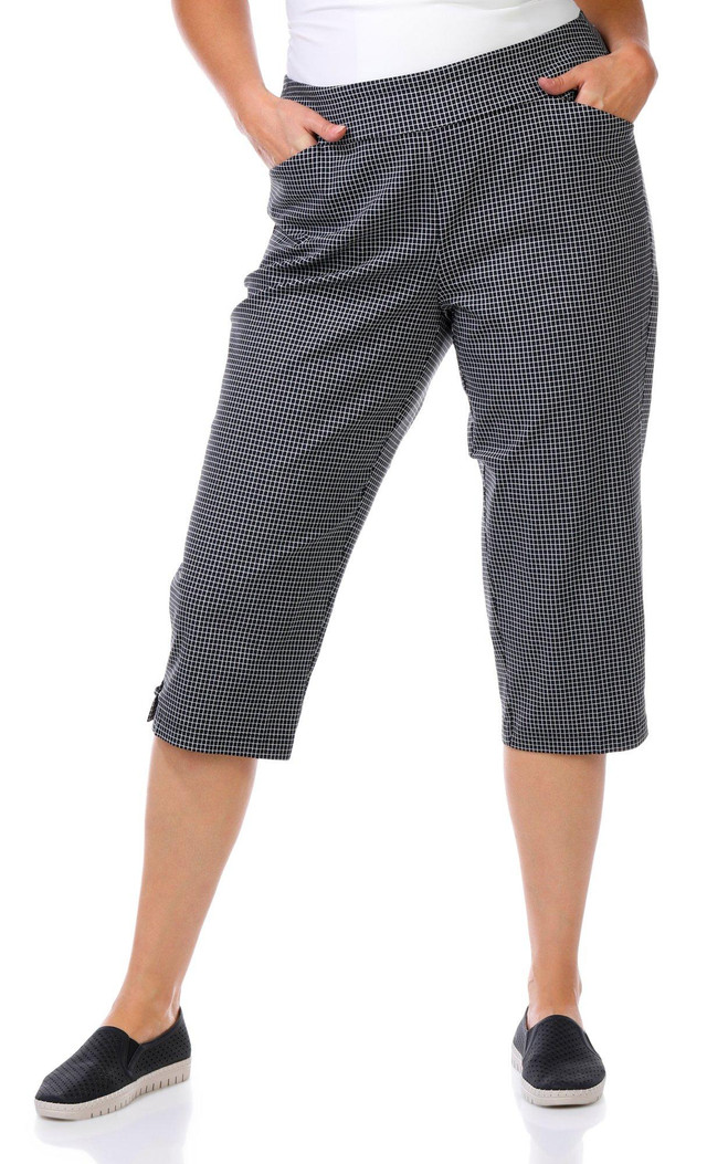 Effortlessly stylish and work-ready, these Petite Grid Print Grommet Capris feature a flattering pull-on waistband, chic grid print, and functional front pockets. With a 21 inch inseam and sleek grommet detail, they offer comfort and polish for your weekday wardrobe. Fabrication is 75% rayon, 22% nylon, and 3% spandex