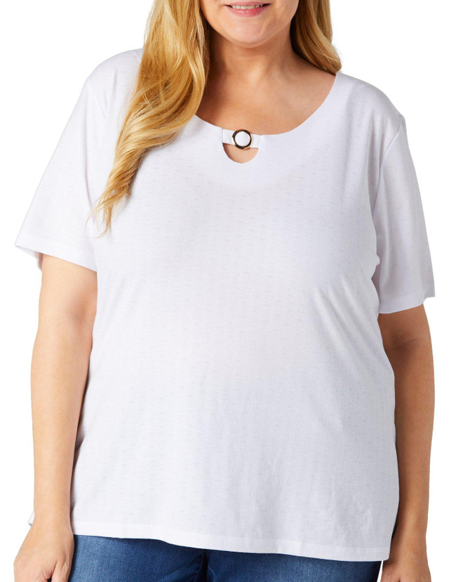Made from a blend of 60% polyester, 32% rayon, and 8% spandex, this top offers a soft, stretchy fabric that feels great all day long. The chic keyhole neckline with a ring detail adds a stylish twist, making it a standout piece for casual outings or semi-dressy occasions. Its versatile design pairs effortlessly with jeans, skirts, or trousers, giving you endless styling possibilities.