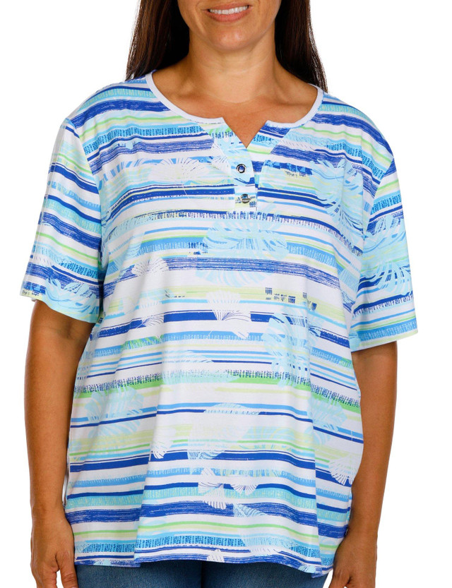 Embrace laid-back charm with this short sleeve top featuring a vibrant palm frond print on soft, lightweight knit fabric. A split neckline with grommet embellishment adds subtle edge, while the relaxed silhouette offers all-day comfort. Perfect for sunny days, casual outings, or vacation-ready looks. Fabrication 95% cotton, 5% spandex