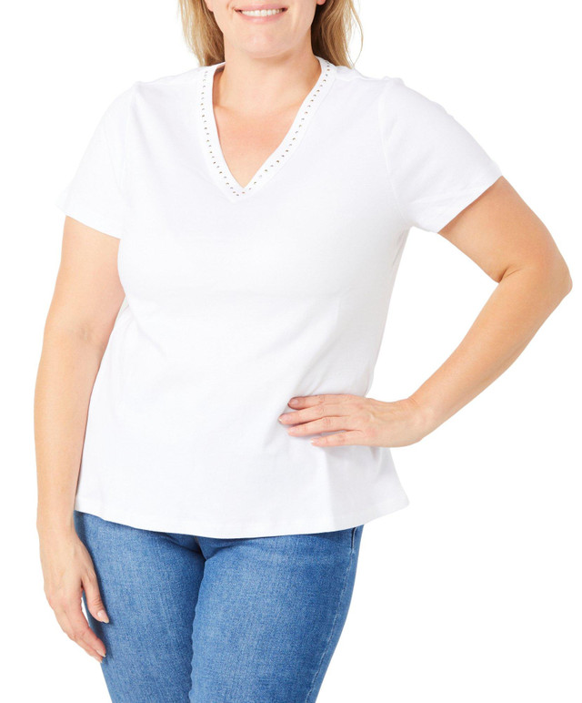 This plus size womens short sleeve top is made from soft cotton and features a flattering V-neckline accented with metal studs for a stylish touch. Fabrication is 100% cotton.