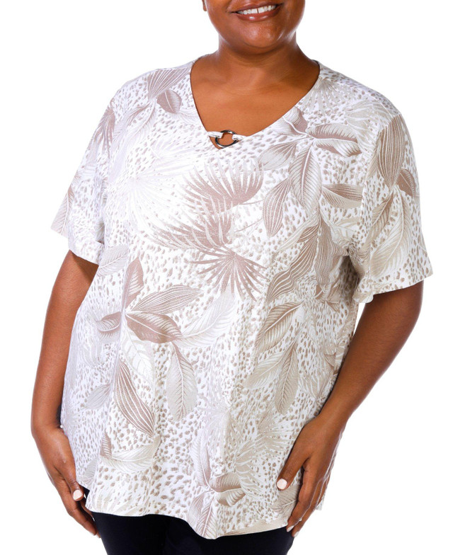 Turn up the tropical charm with this Plus V-Neck Print Top! Featuring a lively mix of floral and pineapple prints, this top brings sunshine to any outfit. The short sleeves keep it breezy, while the ring-accented neckline adds a splash of style. Made from a comfy blend of 95% cotton and 5% spandex, it's soft, stretchy, and ready for wherever the day takes you. Fun, flattering, and effortlessly coolyour wardrobe just got a whole lot brighter!