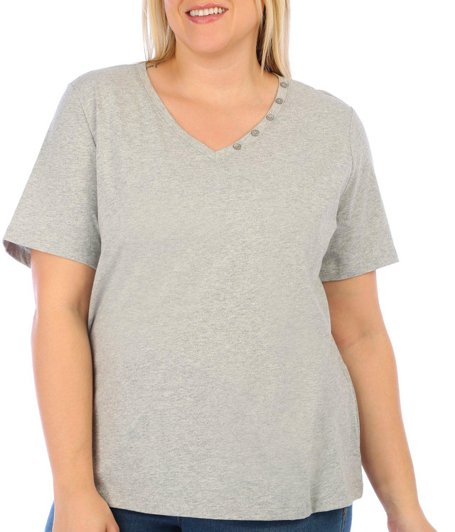 Coral Bay offers classic casual collections for your relaxed lifestyle. This short sleeve top features a solid color design on lightweight knit fabric, a V-neckline with decorative button detail, and classic styling. The top length measures approximately 25 in.