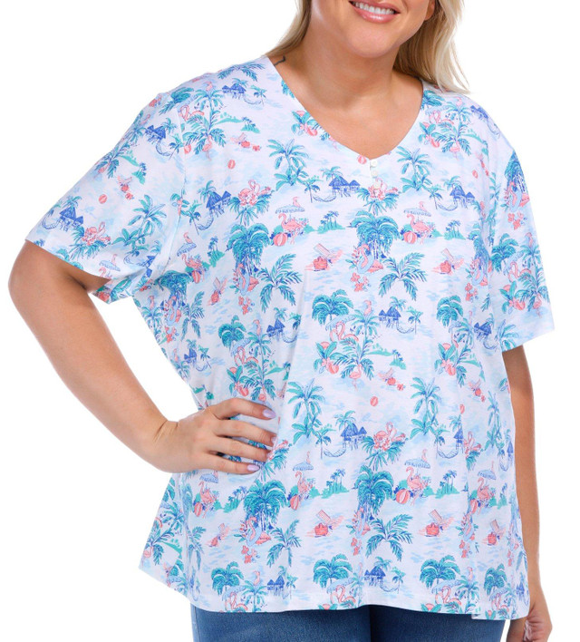 Add a splash of paradise to your wardrobe with our Plus Tropical Flamingo Henley Top. Made from a comfy cotton-spandex blend, it features a vibrant flamingo print, classic henley neckline, and short sleeves, perfect for sunny days and laid-back vibes. Fabrication is 95% Cotton, 5% Spandex. Top length measures approximately 29 in.