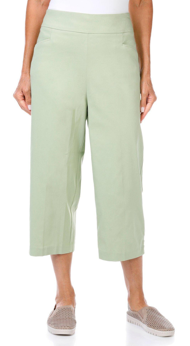 These capris feature a solid color and stretchy fabric for a comfortable, flattering fit. Designed with front pockets and gold bar accents near the calf, they add a touch of polish to a casual staple. Perfect for warm days. Fabrication is 75% rayon, 22% nylon, and 3% spandex.