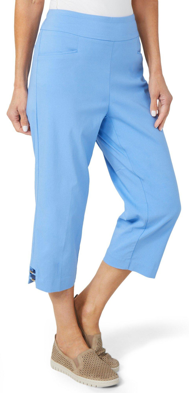 These capris feature a solid color and stretchy fabric for a comfortable, flattering fit. Designed with front pockets and gold bar accents near the calf, they add a touch of polish to a casual staple. Perfect for warm days. Fabrication is 75% rayon, 22% nylon, and 3% spandex.