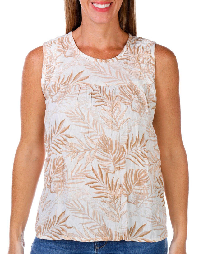 Elevate your summer style with this Women's Leaf Print Crepon Tank Top. Featuring a breezy sleeveless design, crew neckline, and a chic back keyhole detail, its soft crepon fabric and vibrant leaf print make it perfect for warm-weather layering or solo wear. Fabrication 100% rayon