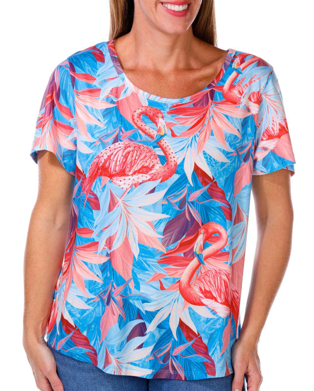 Add a playful touch to your wardrobe with the Women's Short Sleeve Flamingo Feathers Top. Featuring a vibrant flamingo print, round neckline, and short sleeves, it is accented with shimmering stud embellishments for a hint of sparkle. Perfect for casual days with flair. Fabrication 95% polyester, 5% spandex