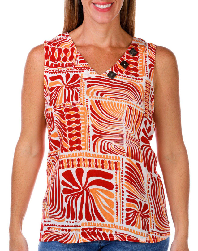 Add a pop of personality with this Women's Sleeveless Print V-Neck Crepon Top. Featuring a stylish allover print, lightweight crepon fabric, and a flattering V-neckline with button embellishments, it is perfect for effortless, warm-weather chic.