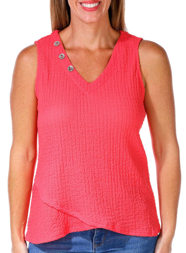 Step up your style with this Women's Sleeveless Textured V-Neck Top. Crafted from lightweight textured fabric in a solid hue, it features a flattering V-neckline with button embellishments and a chic asymmetrical hem for a modern touch. Fabrication 98% polyester, 2% spandex