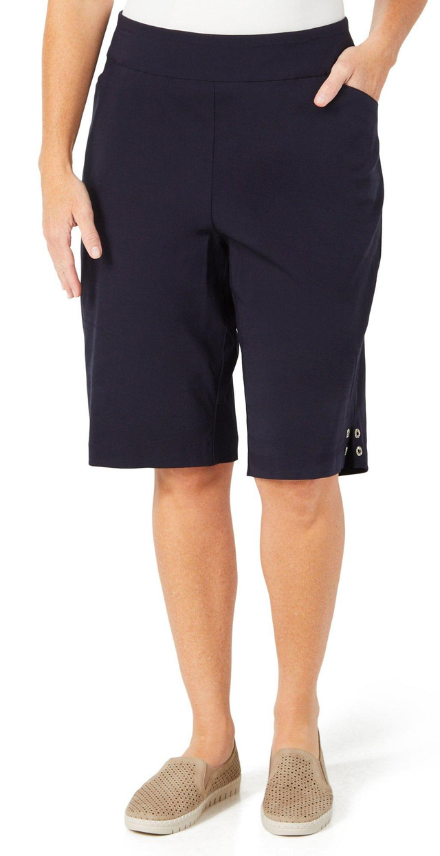 tay cool and confident in these royal blue Bermuda shorts, designed with a comfy stretch waistband and a flattering knee-length cut. Perfect for casual days, travel, or summer outings. Easy to pair, easy to wear. Inseam measures approximately 12 in. Outseam approximately 24 in. Fabrication 75% rayon, 22% nylon, 2% spandex.