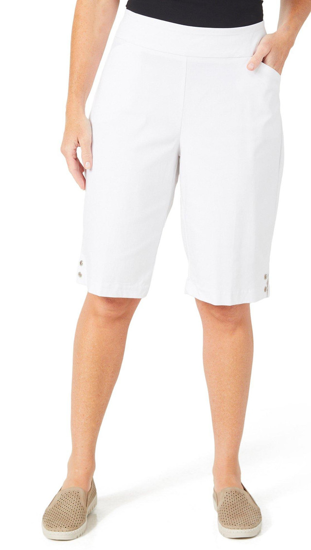 tay cool and confident in these royal blue Bermuda shorts, designed with a comfy stretch waistband and a flattering knee-length cut. Perfect for casual days, travel, or summer outings. Easy to pair, easy to wear. Inseam measures approximately 12 in. Outseam approximately 24 in. Fabrication 75% rayon, 22% nylon, 2% spandex.