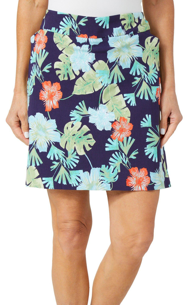 This womens printed skort features comfort stretch fabric and an easy elastic waistband for all day wear. Two side seam pockets add function while the sleek silhouette keeps the look polished and playful. Fabrication is 77% rayon, 20% nylon, and 3% spandex.