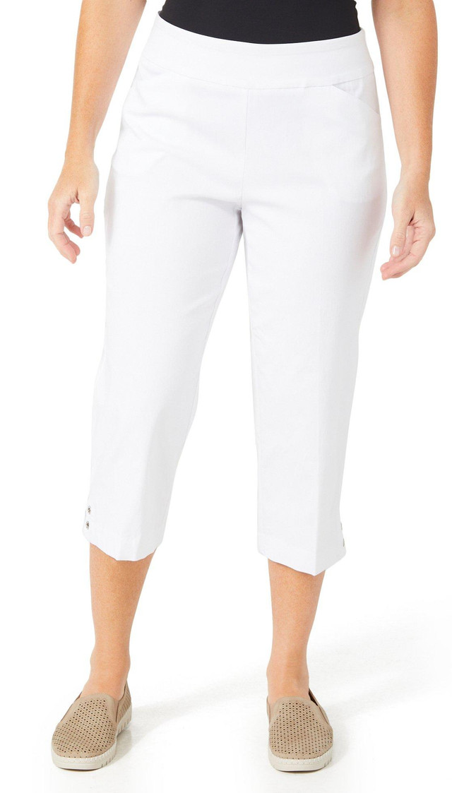 These pull-on capris feature a solid color design on lightweight comfort stretch fabric, easy care, hidden elastic waistband for optimal comfort, a slimming tummy panel, front pockets, and embellished diamond grommet hemlines. Inseam measures approximately 21 inches. Outseam measures approximately 32 inches from waistband to hemline. Fabrication 75% rayon, 22% nylon, 3% spandex.