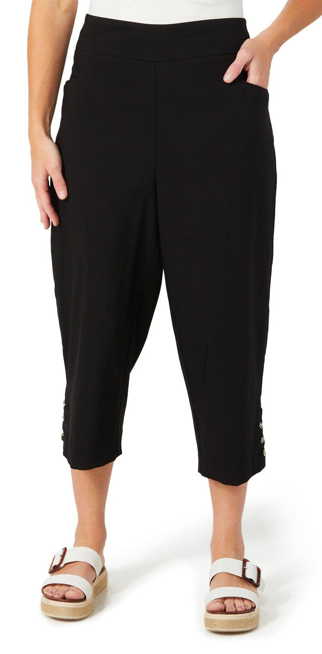 Elevate your everyday look with these ultra chic capris, crafted from a comfortable and reactive fabric blend. Featuring a sleek solid color, floral button accents at the ankle, and functional front pockets, these pull-on capris offer both comfort and a touch of glam. Inseam measures 21 in. Fabrication is 75% rayon, 22% nylon, 3% spandex.