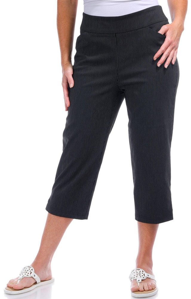 Step into effortless style with these womens 21 inch striped capris. Crafted from a soft blend of viscose, nylon, and spandex, they feature a chic pinstripe design, pull-on waistband, front pockets, and grommet accents at the ankles. Perfect for polished comfort all day.