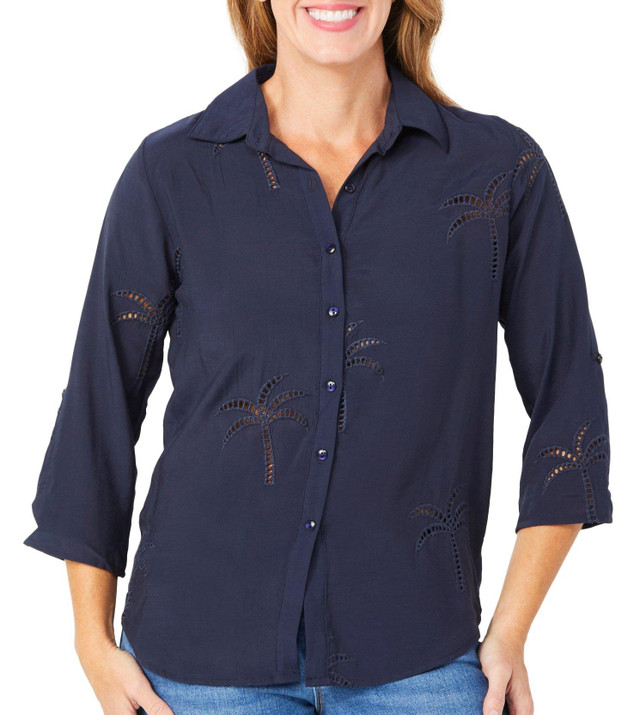 Stay effortlessly stylish in our Womens 3/4 Sleeve Embroidered Palm Button-down Top. Crafted from lightweight fabric, it features a solid color, classic collared neckline, and elegant embroidery for a refined touch. Perfect for layering or wearing solo. Fabrication 62% rayon, 38% polyester