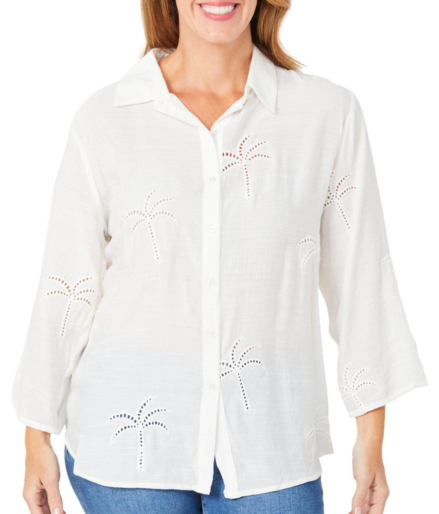 Stay effortlessly stylish in our Womens 3/4 Sleeve Embroidered Palm Button-down Top. Crafted from lightweight fabric, it features a solid color, classic collared neckline, and elegant embroidery for a refined touch. Perfect for layering or wearing solo. Fabrication 62% rayon, 38% polyester