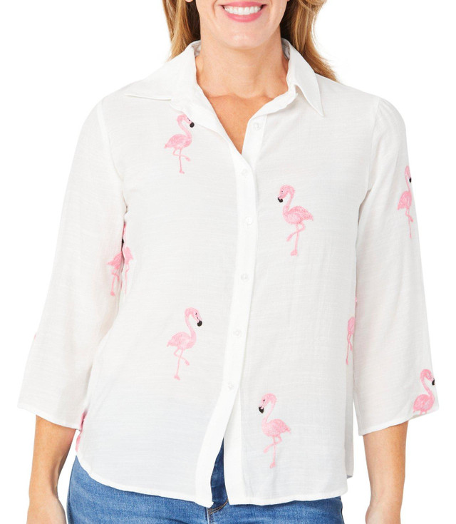Step into sunshine with this charming womens top. The embroidered flamingo design adds a playful touch to the crisp collar and button front. Soft 3/4 sleeves offer comfort and style that moves with you. Perfect for bright days and breezy moods. Fabrication 62% rayon, 38% polyester