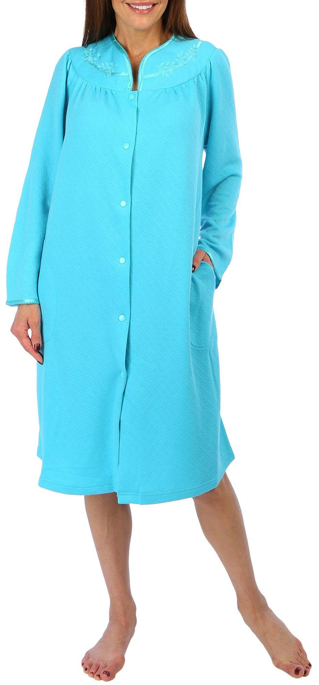 Wrap yourself in luxury with our Quilted Buttoned Bath Robe. Featuring elegant quilted-style embroidery, this robe combines sophistication with comfort. The snap-buttoned front ensures a secure fit, while the two front pockets add practicality and convenience. Perfect for lounging at home or stepping out of the bath, this robe offers a cozy embrace that makes every moment feel indulgent. Measures approximately 42 in. from shoulder to hem.