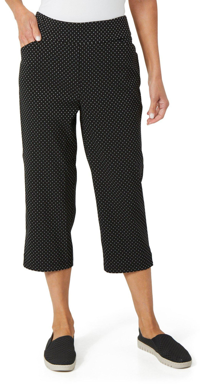 Effortlessly stylish, these Women's Dotted Grommet Capris feature a comfortable pull-on waistband, functional front pockets, and a chic 21-inch inseam. Grommet accents at the hem add a modern touch, making them perfect for casual days with a hint of flair. Fabrication 64% rayon, 22% polyester, 11% nylon, 3% spandex
