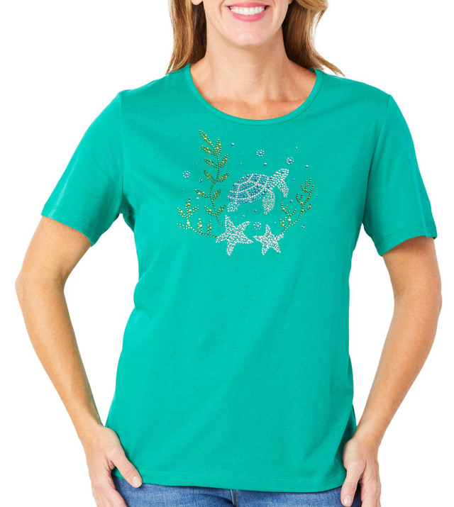 Make a splash with the Women's Embellished Sea Turtles Tee. Designed with a classic round neckline and short sleeves, this charming top features a shimmering sea turtle motif that brings coastal vibes and a touch of sparkle to your everyday wardrobe.