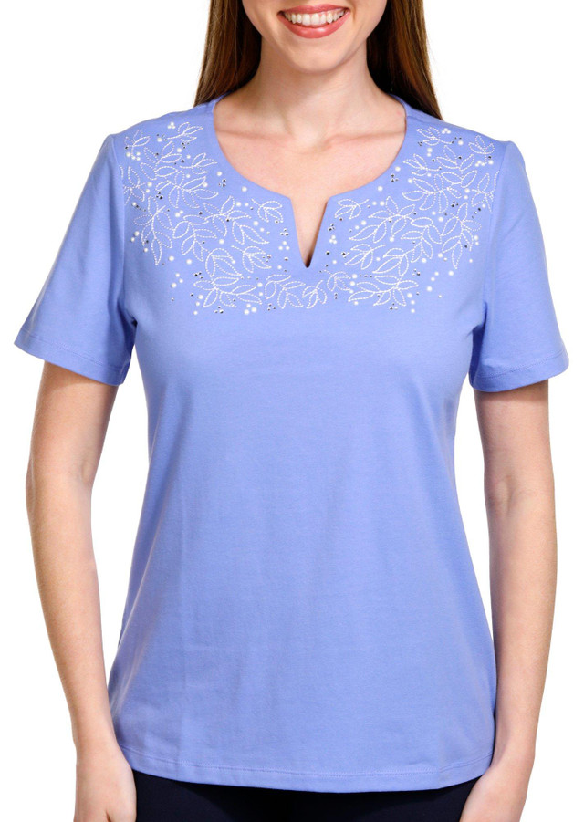 Elevate your wardrobe with this Women's Embellished Split Neck Short Sleeve Top. Crafted from a comfortable and durable 60/40 cotton-polyester blend, this top is designed for both style and practicality. The elegant split neckline is adorned with eye-catching embellishments, adding a subtle sparkle to your outfit.