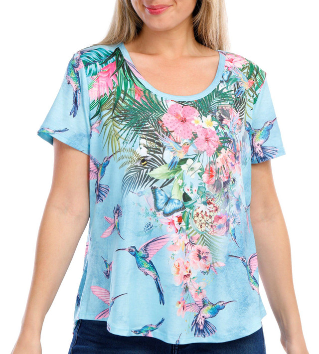 This womens embellished tropical print top is made from a soft blend of 95% polyester and 5% spandex, offering a comfortable, stretchy fit. The vibrant tropical print is beautifully enhanced with delicate embellishments, adding a touch of sparkle to your casual look. Perfect for pairing with jeans or skirts for a stylish, laid-back outfit.