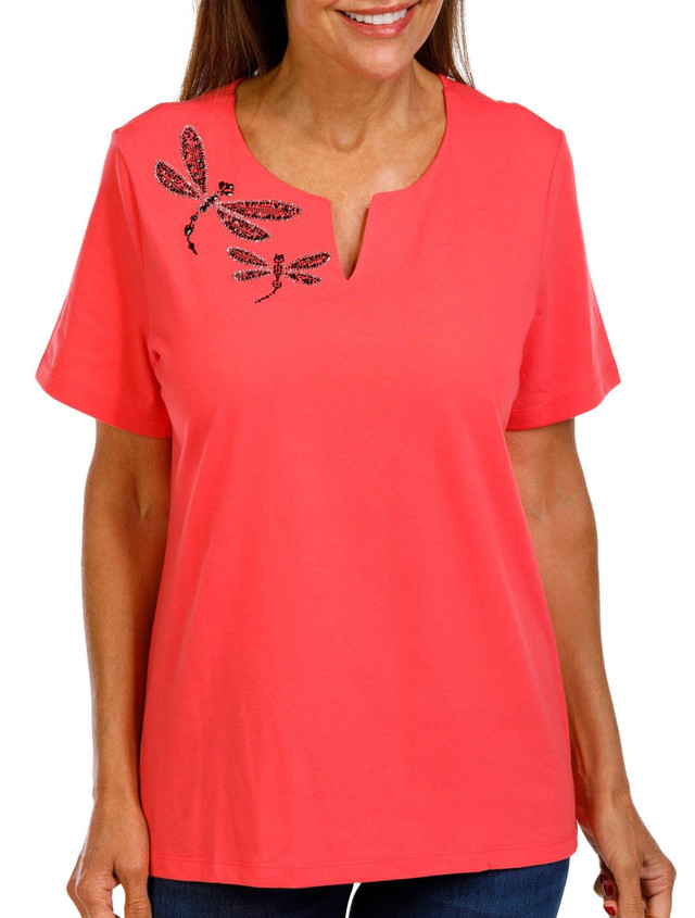 Elevate your everyday wardrobe with this stunning Women's Embellished V-Neck Short Sleeve Top. Crafted from a premium cotton-polyester blend, this top offers the perfect combination of softness, breathability, and durability. The classic V-neckline is enhanced with delicate dragonfly embellishments, adding a touch of sparkle that effortlessly transitions from casual to chic. Top length measures approximately 27 in. Fabrication is 60% cotton, 40% polyester.