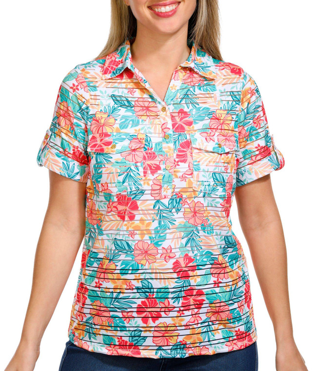 This womens floral print burnout polo combines a classic silhouette with a touch of modern flair. The soft burnout fabric adds a stylish, vintage feel, while the vibrant floral print brings a fresh, feminine touch. Perfect for casual or semi-casual occasions, this polo offers both comfort and standout style. Measures approximately 26 in. Fabrication is 95% polyester and 5% spandex.
