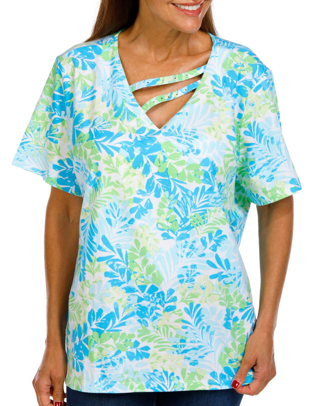 Bring tropical flair to your look with this Women's Frond Print V-Neck Top. Featuring a vibrant palm print, rhinestone embellished double straps, and short sleeves, it blends comfort with eye-catching detail. Fabrication 95% cotton, 5% spandex