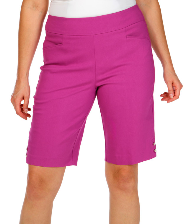 Add a touch of elegance to your summer wardrobe with these Women's Gold Bead Bermuda Shorts. Made from a soft, stretchy blend of nylon, rayon, and spandex, they feature a sleek solid color, gold bead accents at the hem, a comfortable pull-on waistband, and handy front pockets.
