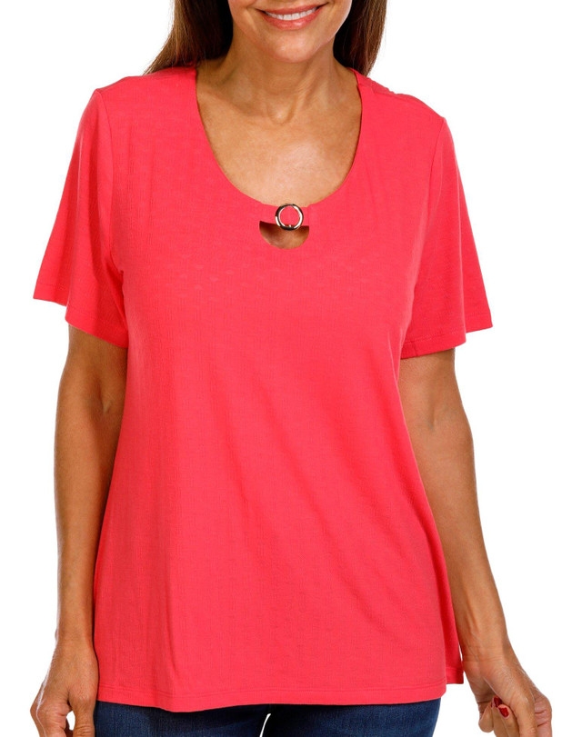 Designed with a flattering fit, this top is made from a comfortable blend of polyester/rayon/spandex, offering the perfect mix of softness and stretch. The textured fabric and the chic keyhole neckline with a ring detail adds a touch of modern sophistication, making it versatile for both casual and semi-formal occasions. A go-to piece for any wardrobe, this top pairs beautifully with skirts, jeans, or trousers for a polished look every time. Fabrication is 60% polyester, 32% rayon, 8% spandex.