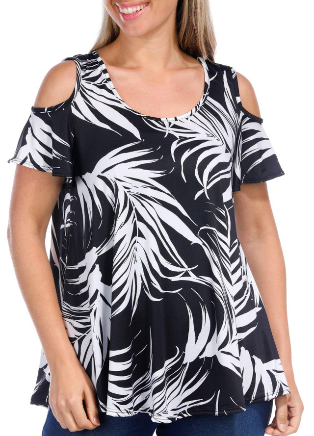 Stay cool and stylish in this Womens Leaf Print Cold Shoulder Top. Featuring a breezy leaf print, classic round neckline, and trendy cold shoulder sleeves, its the perfect blend of comfort and flair for warm-weather days. Fabrication is 96% polyester and 4% spandex.