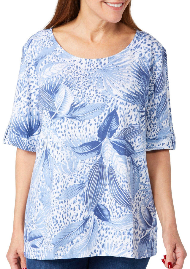 Introducing the Women's Palm Fronds Short Sleeve Top, crafted from a comfortable blend of cotton and spandex. This stylish top features a vibrant palm frond print, a classic round neckline, and short roll tab sleeves. With a 26-inch length, it offers a relaxed yet chic look perfect for any casual outing. Combining fashion and comfort, this top ensures you stay stylish and comfortable throughout your day.