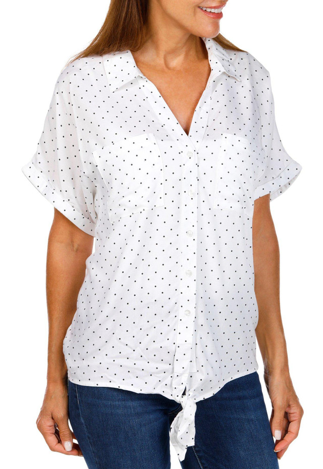 Stay effortlessly chic in this Women's Short Sleeve Tie Front Top. Featuring a whimsical polka dot print, button-down front, flattering v-neckline, and a playful tie-front hem, it's perfect for warm days and casual outings. Pair it with jeans or shorts for a fresh, feminine look. Fabrication is 100% rayon.