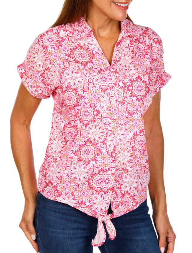 Stay effortlessly chic in this Women's Short Sleeve Tie Front Top. Featuring a tropical floral print, button-down front, flattering v-neckline, and a playful tie-front hem, it's perfect for warm days and casual outings. Pair it with jeans or shorts for a fresh, feminine look. Fabrication is 100% rayon.
