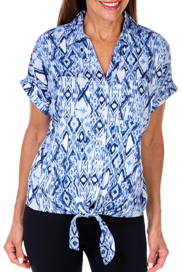 This womens short sleeve blouse combines casual charm with tailored details. It features a split neckline with a smart collar, functional pockets, and a classic button-down front. A tie at the bottom adds a playful twist, perfect for styling with jeans or skirts for a relaxed yet put-together look. Fabrication is 100% rayon.