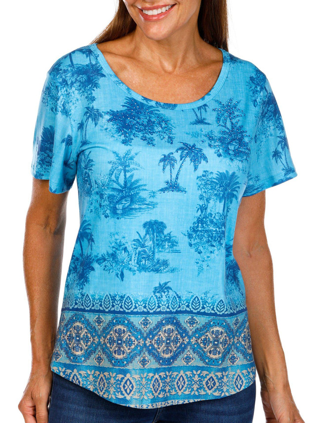 This Short Sleeve Printed Tee with a palm tree design is a stylish addition to any wardrobe. Featuring a crew neckline, this tee combines casual comfort with a touch of elegance. The intricate printed design is beautifully embellished, adding a unique and eye-catching element to the shirt. Fabrication is 95% polyester, 5% spandex.